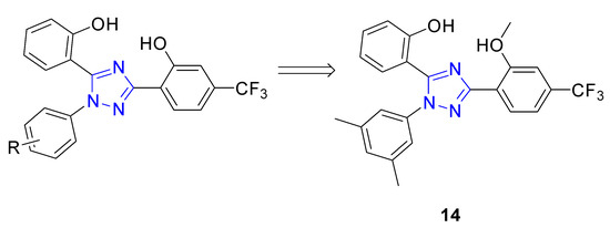 Development of 1,2,4-triazole derivatives as Nrf2 activators. The triazole moiety is in blue. The presence of alkyl groups on the diaryl-triazole scaffold was important for the activity, and 14 emerged as a potential neuroprotectant for the treatment of cerebral ischemic injury [79].