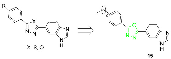 Further modifications of compound’s 11 azole core led to a series of 1,3,4-oxadiazole or 1,3,4-thiadiazole derivatives (Figure 12), displaying a potency of action as Nrf2 activators similar to the 1,2,4-oxadiazole derivatives (Figure 10) [80]. On the contrary, physicochemical properties were improved, since the presence of the 1,3,4-oxadiazole moiety led to lower lipophilicity, and it improved the aqueous solubility of these molecules. Compound 15 (Figure 12), displaying 1.8-fold induction of Nrf2 in a luciferase reporter assay at 100 nM, was selected for further evaluation. It was able to increase Nrf2 levels and its downstream genes in H2O2-treated PC-12 cells, protecting them from oxidative damage.