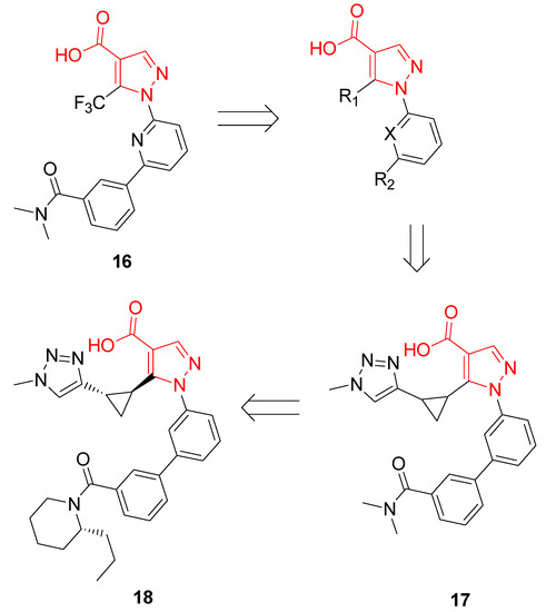 Development of pyrazole carboxylic acid inhibitors of the Keap1/Nrf2 complex protein–protein interactions. The pyrazole-carboxylic acid moiety is in red. Starting from the leading scaffold of 16, i.e., the pyridyl-pyrazole carboxylic acid core structure, the triazole-cyclopropyl-derivative 17 was developed, showing a potent Nrf2 activation. This compound was further optimized by introducing a larger amide group, and the Nrf2 activator 18 was obtained, which was able to bind the Keap1 Kelch domain with increased affinity [81].