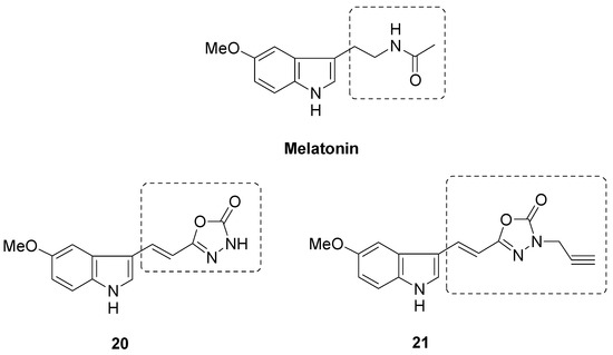 Melatonin is a hormone that binds the G protein-coupled receptors MT1 and MT2, as well as the cytosolic receptor MT3/quinone reductase 2 (QR2). QR2 catalyzes the reduction of electrophilic quinones to hydroquinones, which can trigger an overproduction of free radicals. For this reason, this enzyme can be considered a molecular target involved in neurotoxic cascades [95]. Within the framework of a study of oxadiazolone-based bioisosteres of melatonin, two compounds (20 and 21, Figure 16) were developed, showing an induction of signaling mediated by Nrf2 (induction capability of 15.1 and 1.76, respectively) and an inhibition of QR2 (Ki 6.6 nM and 3.2 nM, respectively) in a neuronal phenotype [96].