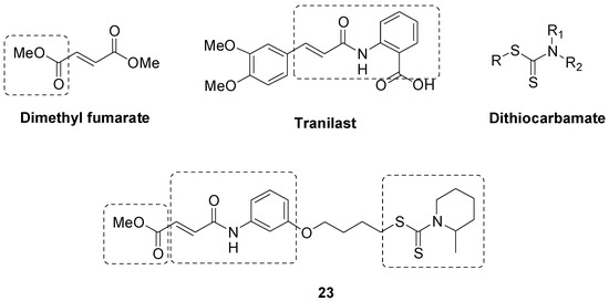 The cholinergic hypothesis of AD suggests that the cognitive decline observed in the disease can be attributed to a selective loss of cholinergic neurons of the basal forebrain. Acetylcholinesterase (AChE) hydrolyzes acetylcholine (ACh), terminating the cholinergic transmission. AChE inhibitors, considered in the therapeutic armamentarium of AD, prevent the degradation of the neurotransmitter, allowing to prolong the action of the deficient neurotransmitter in the brain [101]. Three scaffolds were combined to form a series of molecules containing a flexible carbon chain: (i) dimethyl fumarate, containing an α,β-unsaturated ketone, a representative structure for Nrf2 activation, (ii) tranilast, an old antiallergic drug with anti-inflammatory properties patented for treating AD [102], and (iii) dithiocarbamate, able to interact with the catalytic active site of AChE. Among the tested derivatives, the most potent inhibitor of human AChE was compound 23 (Figure 18, IC50 53 nM) which also showed activation of the Keap1–Nrf2–ARE pathway, antioxidant and anti-inflammatory effects, and permeation of the BBB [103]. From in vivo studies, it emerged that it ameliorated cognitive deficits in the scopolamine-induced mouse model of AD [103].