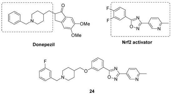 A further combination of Nrf2 activator and AChE inhibitor was recently proposed, characterized by the presence of a 1,2,4-oxadiazole core and benzylpiperidine [103]. Among the various derivatives synthesized, compound 24 was selected as the representative molecule (Figure 19).
