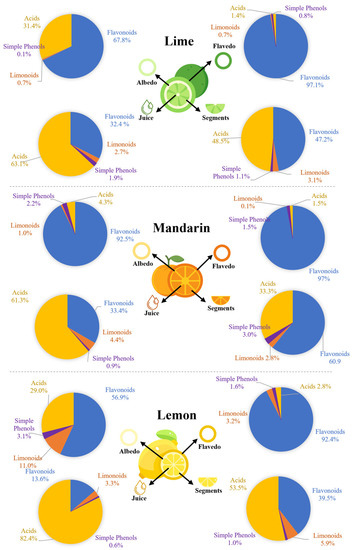 In this report, the spatial distribution and antioxidant activity of bioactive compounds in limes, lemons, and mandarin tissues were studied. We observed that flavonoids were predominant in the flavedo and albedo of the three fruits (97.1% and 67.8%, respectively, in limes; 97.0% and 92.5% in mandarins; and 92.4% and 56.9% in lemons). However, hesperidin, diosmin, and eriocitrin were the most concentrated flavonoids in limes; hesperidin and naringin were predominant in mandarins; and apigenin and diosmetin derivatives and hesperidin were highly concentrated in lemons. The presence of these functional ingredients has been previously described in other citrus limon varieties but not distributed in the different tissues of the fruit [16]. Similarly, limonin derivatives were the most concentrated limonoids in limes and mandarins, while nomilin derivatives were the most abundant in lemons.