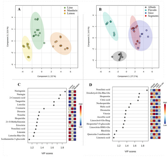 Multivariate PLS-DA for discrimination of citrus fruits (A) and samples (B) based on the composition of extracts. Variable importance projection (VIP) scores for identification of metabolites with the highest discrimination capability of citrus fruits (C) and samples (D).