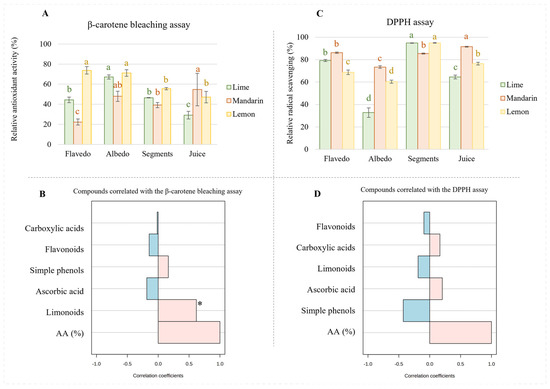 Antioxidant activity (A) and radical scavenging capacity (B) measured in extracts from citrus fruits. Spearman correlation between antioxidant assays and concentrations of families of metabolites (β-carotene test, (C); DPPH assay, (D)). Different letters for the same fruit indicate significant differences among tissues extracts in terms of antioxidant or radical scavenging activity. * p-value < 0.001.