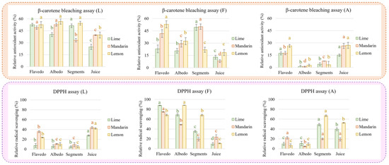 Antioxidant activity (β-carotene bleaching assay) and radical scavenging potential (DDPH assay) measured in fractions enriched in limonoids (L), flavonoids (F), and carboxylic acids (A) obtained by separation of extracts from citrus fruits. Different letters for the same fruit and fraction indicate significant differences in antioxidant or radical scavenging activity.