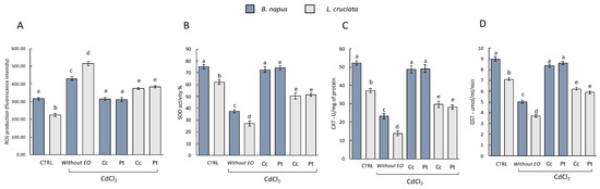 (A) ROS production and antioxidant/detoxifying enzyme activities (B) SOD, (C) CAT, and (D) GST in B. napus and L. cruciate in the control samples [i.e., without pretreatment with Cachrys cristata (Cc) and Prangos trifida (Pt) essential oils (EOs), and without treatment with CdCl2], in samples without pretreatment with EOs and exposed to treatment with CdCl2, and in samples pretreated with EOs and exposed to CdCl2 treatment. Bars not accompanied by the same letter (a–e) were significantly different at p < 0.05. Data are mean of three independent experiments ± SE (n = 5).