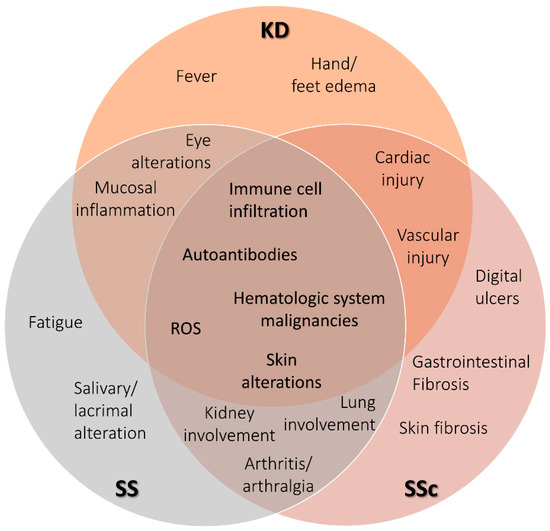 Venn diagram showing phenotypic characteristics of SS, KD, and SSc. Terms shown in the diagram are keywords defining clinical and molecular features characteristic of each rare autoimmune disease. The overlapping sections shows terms shared by the respective disease. Kawasaki disease (KD), Sjögren’s syndrome (SS), and systemic sclerosis (SSc).