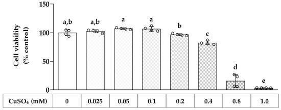 Effects of CuSO4 on the viability of HaCaT cells. Cells were treated with CuSO4 at varying concentrations for 48 h for the viability assay. Cell viability is presented as % of the control group (mean ± SD, n = 4). Different lowercase letters (a–e) indicate significantly different means at the p < 0.05 level.