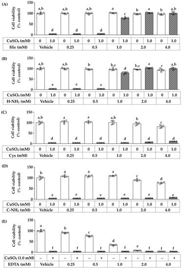 Effects of histidine (A), histidinamide (B), cysteine (C), cysteinamide (D), and EDTA (E) on the CuSO4-induced cytotoxicity. HaCaT cells were treated with a test material at varying concentrations in the absence and presence of 1.0 mM CuSO4 for 48 h. Cell viability was presented as % of the control group (mean ± SD, n = 4 or 5). Different lowercase letters (a–f) indicate significantly different means at the p < 0.05 level.