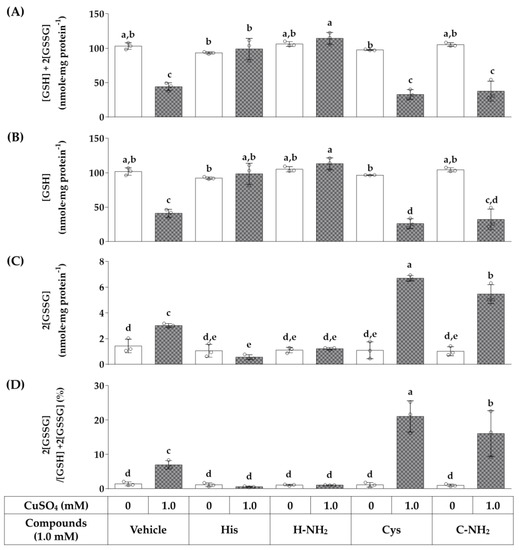 Effects of histidine, histidinamide, cysteine, and cysteinamide on the contents of glutathione (GSH) and glutathione disulfide (GSSG) in HaCaT cells exposed to CuSO4. Cells were treated with each compound at 1.0 mM in the absence and presence of 1.0 mM CuSO4 for 12 h. The total content of GSH plus GSSG (A) and that of GSH (B) were measured separately using an enzyme-based recycling assay, and the values were used to calculate the content of GSSG (C) and the ratio of the oxidized and reduced forms (D). Data are presented as mean ± SD (n = 3). Different lowercase letters (a–e) indicate significantly different means at the p < 0.05 level.