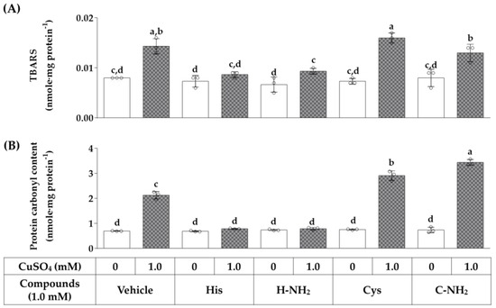 Effects of histidine, histidinamide, cysteine, and cysteinamide on the lipid peroxidation (A) and protein carbonylation (B) in HaCaT cells exposed to CuSO4. Cells were treated with each compound at 1.0 mM in the absence and presence of 1.0 mM CuSO4 for 12 h. The content of thiobarbituric acid-reactive substance (TBARS) as an indication of lipid peroxidation and protein carbonyl content as an indication of protein oxidation were normalized to the protein content. Data represent mean ± SD (n = 3). Different lowercase letters (a–d) indicate significantly different means at the p < 0.05 level.
