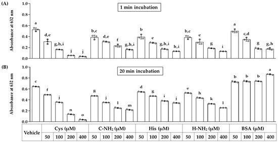 Comparison of copper-chelating activities of cysteine, cysteinamide, histidine, histidinamide, and bovine serum albumin (BSA). The reaction mixture consisting of 200 μM CuSO4, 200 μM PCV, and test material at the specified concentrations was incubated for 1 min (A) or 20 min (B), and the formation of Cu(II)-PCV complex was measured using A632. Data are presented as mean ± SD (n = 3). Different lowercase letters (a–o) indicate significantly different means at the p < 0.05 level.