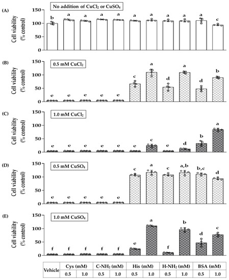 Effects of cysteine, cysteinamide, histidine, histidinamide, and BSA on the viability of HaCaT cells exposed to different Cu(II) salts. Cells were treated with a test material at varying concentrations with no addition (A) or the addition of 0.5 mM CuCl2 (B), 1.0 mM CuCl2 (C), 0.5 mM CuSO4 (D), or 1.0 mM CuSO4 (E) for 48 h. Cell viability is presented as % of the control group (mean ± SD, n = 4). Different lowercase letters (a–f) indicate significantly different means at the p < 0.05 level.
