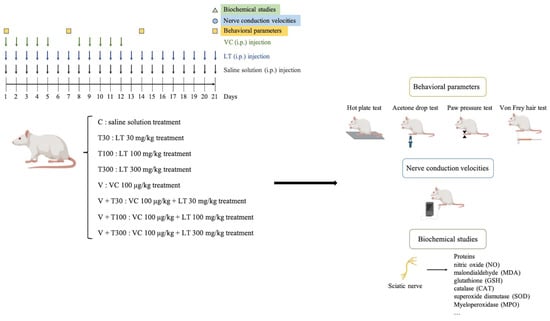 For this study, male Wistar rats were randomly divided into eight groups with eight rats in each group: control (C), LT 30 mg/kg treatment (T30), LT 100 mg/kg treatment (T100), LT 300 mg/kg treatment (T300), VCR treatment (V), VCR + LT 30 mg/kg treatment (V + T30), VCR + LT 100 mg/kg treatment (V + T100), and VCR + LT 300 mg/kg treatment (V + T300). The control group received an intraperitoneal (i.p.) injection of normal saline solution. The T30, T100, and T300 groups received i.p. injections of LT at doses of 30, 100, or 300 mg/kg, respectively, for 21 days. The V group received i.p. injections of 100 μg/kg VCR for two 5-day cycles with a 2-day pause (days 1–5 and 8–12) and normal saline i.p. on days 1–21. The V + T30, V + T100, and V + T300 groups received i.p. injections of 100 μg/kg VCR for two 5-day cycles with a 2-day pause (days 1–5 and 8–12) and LT i.p. at doses of 30, 100, or 300 mg/kg, respectively, on days 1–21. VCR was administered 60 min before the LT or normal saline injection on days 1–5 and 8–12. Behavioral parameters were measured before the VCR administration on day 1 and days 7, 14, and 21 after each LT or normal saline injection. Nerve conduction velocities were measured after the behavioral examinations on day 21 for electrophysiological studies. All biochemical studies were conducted after the electrophysiological experiments were completed (see Figure 1). During the study, eight rats died naturally for unknown reasons.