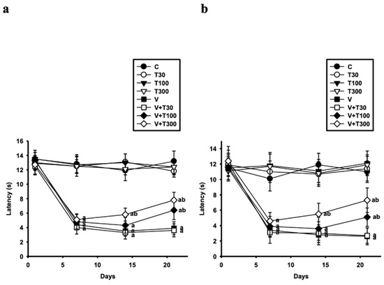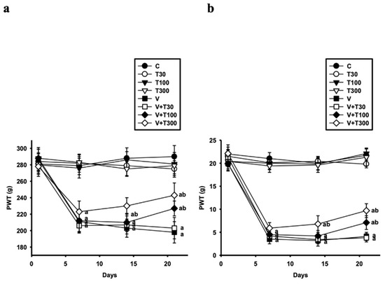 There were no significant differences in the PWT (7 days, p > 0.05; 14 days, p > 0.05; 21 days, p > 0.05) between the V + T30 and V groups. However, the administration of LT (100 and 300 mg/kg) attenuated the VCR-induced decrease in the PWT for mechanical hyperalgesia (14 days—LT 300 mg/kg: 203 ± 11–230 ± 10 g) (V vs. V + T300, p < 0.001) (21 days—LT 100 mg/kg: 198 ± 13–227 ± 9 g and LT 300 mg/kg: 198 ± 13–243 ± 15 g) (V vs. V + T100, p < 0.001 and V vs. V + T300, p < 0.001) and allodynia (14 days—LT 300 mg/kg: 3.2 ± 1.2–6.8 ± 1.8 g) (V vs. V + T300, p < 0.001) (21 days—LT 100 mg/kg: 4.1± 0.9–7.1 ± 1.5 g and LT 300 mg/kg: 4.1 ± 0.9–7.5 ± 1.5 g) (V vs. V + T100, p < 0.001 and V vs. V + T300, p < 0.001) compared with the V group in a dose-dependent manner from day 14 to 21 after the treatment. These results indicate that the LT treatment prevented the VCR-induced development of mechanical hyperalgesia and allodynia. Based on the above results, our observed NP was verified since the LT treatment ameliorated VCR-induced neuropathy.