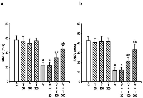 The LT administration (100 and 300 mg/kg) attenuated the VCR-induced decreases in MNCV (LT 100 mg/kg: 21.9 ± 5.1–32.9 ± 5.4 m/s (31%); LT 300 mg/kg: 21.9 ± 5.1–45.1 ± 4.7 m/s (65%)) (V vs. V + T100, p < 0.001; V vs. V + T300, p < 0.001) and SNCV (LT 100 mg/kg: 11.6 ± 3.6–21.4 ± 3.9 m/s (32%); LT 300 mg/kg: 11.6 ± 3.6–33.1 ± 5.9 m/s (70%)) (V vs. V + T100, p < 0.001; V vs. V + T300, p < 0.001) in a dose-dependent manner. These results indicate that the LT treatment prevented a VCR-induced loss of neuronal electrical function.