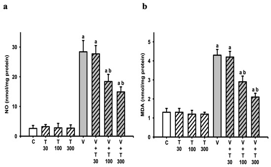 However, the treatment with LT at doses of 100 mg/kg and 300 mg/kg significantly inhibited the elevated nitrite and MDA levels in the V groups (nitrite: 28.4 ± 3.8–18.4 ± 2.4 nmol/mg protein (−39%) and MDA: 4.3 ± 0.3–2.9 ± 0.3 nmol/mg protein (−47%)) (V vs. V + T100, nitrite: p < 0.001 and MDA: p < 0.001) (nitrite: 28.4 ± 3.8–14.9 ± 1.7 nmol/mg protein (−52%) and MDA: 4.3 ± 0.3–2.1 ± 0.2 nmol/mg protein (−73%)) (V vs. V + T300, nitrite: p < 0.001 and MDA: p < 0.001). These results suggest that the LT treatment could effectively inhibit VCR-induced increases in sciatic nitric oxide and lipid peroxide production.