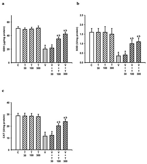 However, the decreased levels of GSH, SOD, and CAT in the V groups were significantly restored after the LT 100 mg/kg treatment (GSH: 20.1 ± 2.8–35.1 ± 2.7 μg/mg protein (49%); SOD: 0.4 ± 0.1–1 ± 0.2 U/mg protein (50%); CAT: 11.6 ± 1.8–20.3 ± 1.8 U/mg protein (51%)) (V vs. V + T100, GSH: p < 0.001; SOD: p < 0.001; CAT: p < 0.001) and 300 mg/kg treatment (GSH: 20.1 ± 2–42.3 ± 2.9 μg/mg protein (73%); SOD: 0.4 ± 0.1–1.1 ± 0.2 U/mg protein (58%); CAT: 11.6 ± 1.8–23.9 ± 2.1 U/mg protein (72%)) (V vs. V + T300, GSH: p < 0.001; SOD: p < 0.001; CAT: p < 0.001). Therefore, the results suggest that the LT treatment prevented VCR-induced decreases in sciatic antioxidation power.