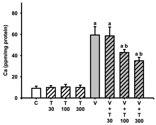 The increased total calcium levels in the V groups were inhibited by the LT 100 mg/kg treatment (59.4 ± 7.9–42.9 ± 2.8 ppm/mg of protein (−33%)) (V vs. V + T100, total calcium: p < 0.001) and 300 mg/kg treatment (59.4 ± 7.9–35.1 ± 3.2 ppm/mg protein (−48%)) (V vs. V + T300, total calcium: p < 0.001). These results indicate that the LT treatment inhibited VCR-induced increases in sciatic total calcium.