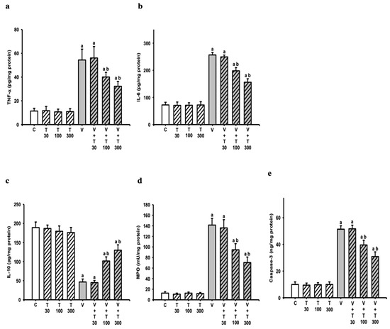 Further, sciatic neuroinflammation and severe neurodegeneration were closely correlated with VCR-induced neuropathy. The levels of TNF-α, IL-6, IL-10, MPO, and caspase-3 were examined. Compared with the C groups, the sciatic levels of TNF-α (11.4 ± 2.4–54.4 ± 9.1 pg/mg protein) (p < 0.001) (Figure 8a), IL-6 (72.4 ± 9.6–256.7 ± 9.3 pg/mg protein) (p < 0.001) (Figure 8b), MPO (12.6 ± 2.6–141.4 ± 12.8 U/mg of protein) (p < 0.001) (Figure 8d), and caspase-3 (9.9 ± 2–51.4 ± 2.6 ng/mg protein) (p < 0.001) (Figure 8e) were increased; however, the sciatic level of IL-10 (189.1 ± 14.6–46.6 ± 7.8 pg/mg protein) (p < 0.001) (Figure 8c) was decreased in the V groups on day 21.