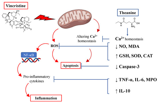 Our findings indicate that calcium accumulation within cells increased neuronal oxidative stress in VCR-induced neuropathy [35]. This buildup can activate secondary messengers, such as calpain and calmodulin, which alter neuronal excitability and lead to axonal degeneration by affecting the stability of axonal cytoskeleton proteins, resulting in hyperalgesia and allodynia [35,38]. Mitochondrial alterations may also contribute to VCR-induced neurotoxicity, calcium changes, oxidative stress changes, and dying back neuropathy [39]. LT’s calcium homeostasis action, which binds to glutamate receptors to prevent an excess calcium increase and maintain mitochondrial functions [40], likely contributes to ameliorating VCR-induced neuropathy. Nitrosative and oxidative reactions may also play a role in neuropathy development, as evidenced by significant increases in nitrite and MDA levels in nerve tissue following VCR administration, along with decreased levels of GSH, SOD, and CAT [41,42].