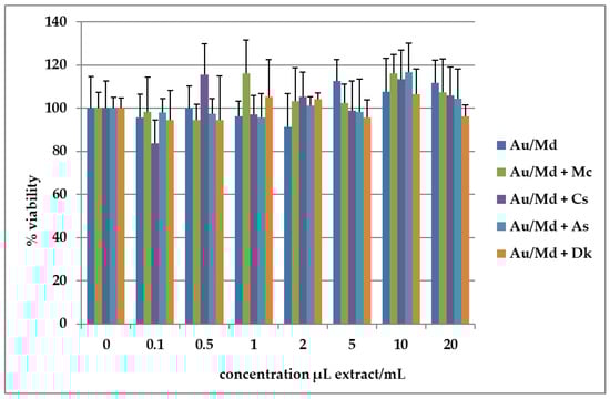 Before testing direct antioxidant activity, the five phenolic extracts deriving from our freshly prepared smoothies were tested on differentiated Caco-2 intestinal cells to ascertain the absence of toxicity at increasing concentrations (0–20 µL extract/mL medium) by the routine MTT test. According to the findings of De Francisco et al. [30], Caco-2 cell lines are often used as intestinal models to investigate the effect of novel food ingredients on cell viability. Moreover, as described by Meunier et al. [31], the functional characteristics and morphology of Caco-2, when used as differentiated cells, are very like enterocytes (tight junctions and apical and basolateral layers, as well as microvilli present on the apical surface). In our experiments, cell viability remained unchanged in the presence of the Au/Md extract at all concentrations tested, compared to untreated cells (100% viability). Notably, the same outcome occurred for cells treated with Au/Md smoothie supplemented with fruits (Mc, Dk, As, and Cs). The addition of phenolic substances to the already concentrated Au/Md extract (as shown in Table 1) did not lead to an increase in toxicity in Caco-2 monolayers, therefore it was possible to further test these concentrations to evaluate the antioxidant activity of the five extracts.