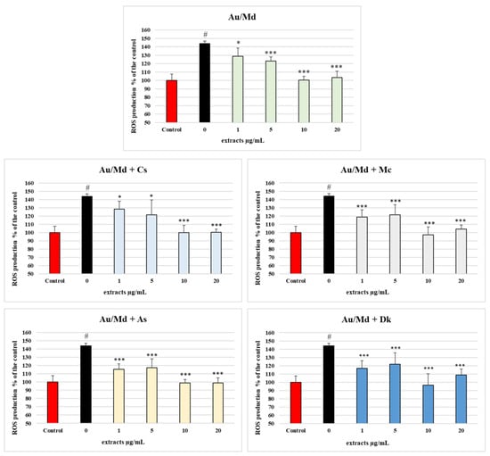 Determination of intracellular ROS production. ROS level, visualized as H2-DCF-DA fluorescence and expressed as % of the control samples (non-oxidized nor pretreated samples), in Caco-2 after 60 min incubation with TBH 2.5 mmol/L and pretreated with the extracts (0–20 µg/mL) of five selected fresh final products (Au/Md, Au/Md + Cs, Au/Md + Mc, Au/Md + As, and Au/Md + Dk) (μg/mL, 30 min). # = p < 0.001 vs. control; * = p < 0.05 vs. TBH 2.5 mmol/L; *** = p < 0.001 vs. TBH 2.5 mmol/L.