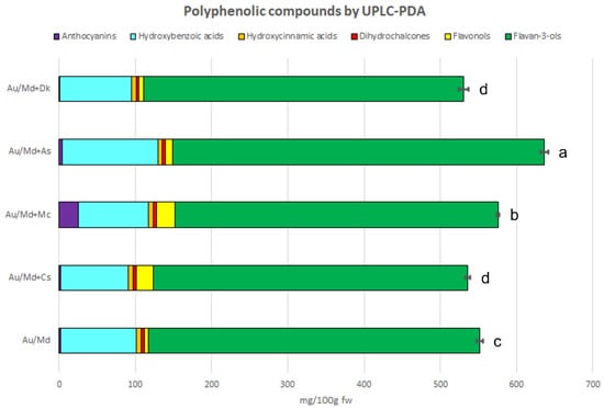 Besides the high amount of polymeric procyanidins and hydroxybenzoic acids in all smoothies, anthocyanins (25.12 mg/100 g fw) and flavonols (25.03 mg/100 g fw) dominated in the Au/Md + Mc smoothie, while in the Au/Md + Cs smoothie, flavonols (22.59 mg/100 g fw) additionally dominated.