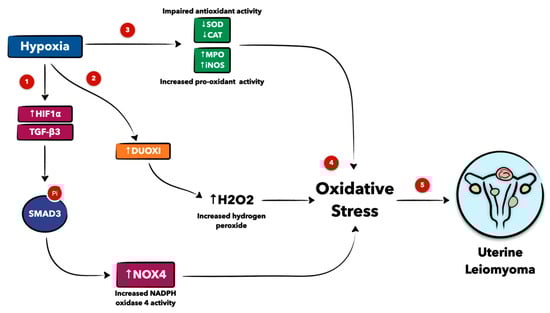 Furthermore, hypoxia can have proliferative effects on human fibroid cells by inducing the expression of NADPH oxidase 4 (NOX4) through the HIF-1α/TGF-β3/Smad3/NOX4 signaling pathway, wherein the phosphorylation of Smad3 by TGF-β3 under hypoxic conditions leads to cellular proliferation and fibroid growth (Figure 2) [8]. The NOX family creates superoxide ions, inducing oxidative stress in cells [35]. NOX4 mRNA and protein levels are significantly higher in fibroids compared to myometrial cells when exposed to hypoxic environments [8,35]. Similarly, NOX4 has been shown to be overexpressed in various tumor types and implicated in cellular proliferation and survival [35]. In addition, hypoxia induces the expression of dual oxidase (DUOXI), an enzyme that creates H2O2 (Figure 2) [35]. Moreover, studies highlighted that the AKT signaling pathway is important to fibroid development under hypoxic environments and seems to be activated by oxidative stress [13].