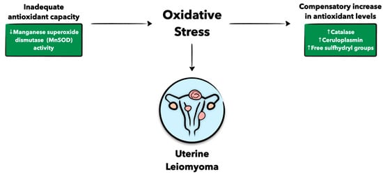 - Santulli, P.; Borghese, B.; Lemarechal, H.; Leconte, M.; Millischer, A.E.; Batteux, F.; Chapron, C.; Borderie, D. Increased serum oxidative stress markers in women with uterine leiomyoma. PLoS ONE 2013, 8, e72069. [Google Scholar] [CrossRef]