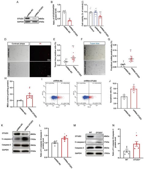To observe the effect of OTUD3 on cell survival, Lv-shRNA-OTUD3 was constructed to knockdown the expression of OTUD3 in SH-SY5Y cells (Figure 1A,B). Cell viability was decreased in the OTUD3 knockdown group (Figure 1C). Meanwhile, the ratio of propidium iodide (PI) and trypan blue positive cells was significantly increased in the OTUD3 knockdown group compared with the control (Figure 1D–G). The MDA release was significantly increased in the OTUD3 knockdown group, which indicated the lipid oxidation level was up-regulated (Figure 1H). We further explored the mode of cell death induced by OTUD3 knockdown. Flow cytometry results showed that the Annexin V positive cell rate was evidently increased in OTUD3 knockdown cells (Figure 1I,J). In OTUD3 knockdown cells, the ratio of cleaved-caspase 3/caspase 3 was significantly increased, as well as in the SN of OTUD3−/− mice (Figure 1K–N). These data indicated that knockdown of OTUD3 partially induced dopaminergic neurons deaths through apoptosis.