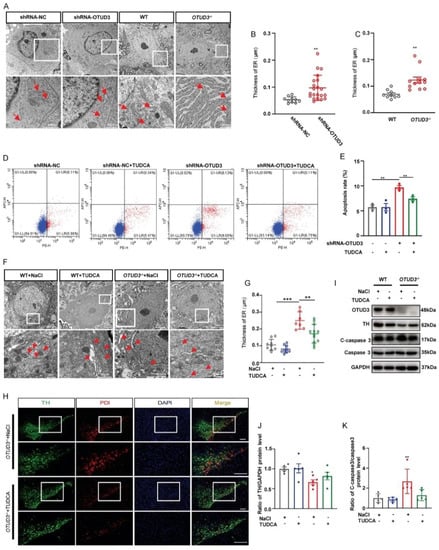 To clarify whether OTUD3 knockdown-induced apoptosis was associated with ER stress, we observed the ER morphology and the expression of PDI (marker protein for ER stress) both in vivo and in vitro. As the main morphological manifestation of ER stress, ER expansion was significantly enlarged in OTUD3 knockdown cells. Likewise, we observed the same phenomenon in dopaminergic neurons of OTUD3−/− mice (Figure 2A–C). Additionally, we treated OTUD3 knockdown cells with ER stress inhibitor tauroursodeoxycholic acid (TUDCA) for 24 h, the proportion of Annexin V positive cells of that was decreased (Figure 2D,E). After TUDCA treatment for two weeks, the ER lumen was markedly decreased in the dopaminergic neuron of OTUD3−/− mice (Figure 2F,G), and the expression of PDI in dopaminergic neurons was also decreased (Figure 2H). There was an upward trend for the expression of TH protein in the SN of OTUD3−/− mice after TUDCA treatment (Figure 2I,J), and the ratio of cleaved-caspase 3/caspase 3 showed a downward trend after TUDCA treatment (Figure 2I–K). These results suggested that OTUD3 knockdown would induce ER stress in dopaminergic neurons both in vivo and in vitro.