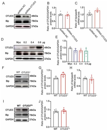 Previous studies have shown that Bip is the target protein of OTUD3 in lung cancer cells [40]. In order to make it clear whether Bip expression changed in vivo and in vitro, we detected protein and mRNA expression levels of Bip both in OTUD3 knockdown cells and the SN of OTUD3−/− mice. However, there were no changes in the expression levels of Bip (Figure 3A–C,F–H). Furthermore, the protein levels of Bip were also unchanged in both OTUD3 overexpression cells and the SN of OTUD3 transgenic (OTUD3TG) mice (Figure 3D,E,I,J). These data suggested that OTUD3 knockdown-induced ER stress did not affect the protein expression of Bip in the SN of mice, which might be related to the fact that the function of OTUD3 is tissue-dependent.