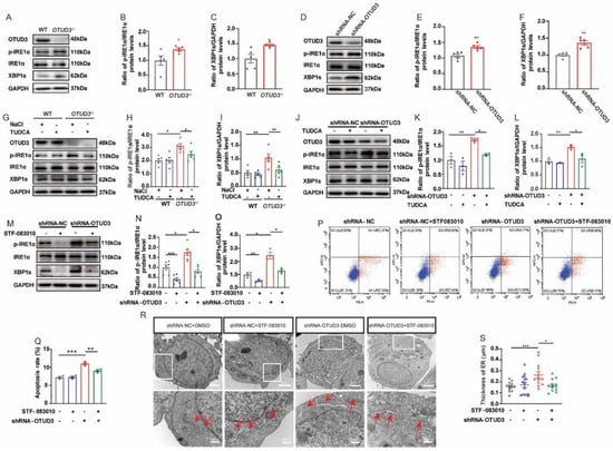 Finally, we observed a significant increase in the ratio of p-IRE1α/IRE1α and the expression levels of XBP1s both in OTUD3 knockdown cells and the SN of OTUD3−/− mice (Figure 4A–F), which were significantly reduced after TUDCA treatment (Figure 4G–L). STF-083010 blocked the increase of p-IRE1α and XBP1’s protein expression after 24 h treatment in OTUD3 knockdown cells. There was no difference between the control and the OTUD3 knockdown-STF-083010 group for the ratio of p-IRE1α/IRE1α and the expression of XBP1s (Figure 4M–O). STF-083010 treatment also inhibited the cell apoptosis of OTUD3 knockdown cells but partially reversed apoptosis after STF-083010 treatment (Figure 4P,Q). Moreover, the thickness of the ER lumen in OTUD3 knockdown cells was reduced after STF-083010 treatment, and there was no difference between OTUD3 knockdown-STF-083010 and control (Figure 4R,S). These results showed that OTUD3 knockdown-induced ER stress activated the IRE1α pathway.