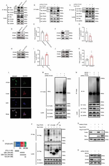 To explore the underlying mechanism by which OTUD3 knockdown activated the IRE1α pathway, we performed co-immunoprecipitation (Co-IP) to detect protein interactions. Our findings indicated that OTUD3 did not directly interact with IRE1α, as endogenous OTUD3 was not immunoprecipitated by IRE1α antibody in shRNA-NC and OTUD3 knockdown cells (Figure 5A). We know that the activity of IRE1α is regulated by two binding proteins, Bip and Fortilin [21]. The co-precipitated signal showed that the binding ability of IRE1α to Bip was decreased in OTUD3 knockdown cells; however, the expression of Bip in whole cell lysate was not changed (Figure 5A). Meanwhile, we observed that the co-precipitated signal of IRE1α and Fortilin was decreased in OTUD3 knockdown cells (Figure 5A,B). The endogenous Fortilin could co-precipitate with OTUD3 (Figure 5B,C). To further explore the relationship between OTUD3 and Fortilin, we validated the expression of Fortilin both in OTUD3 knockdown and overexpression conditions. In OTUD3 knockdown cells and the SN of OTUD3−/− mice, the expression of Fortilin was significantly decreased (Figure 5D–G), whereas it was increased in OTUD3 overexpression cells and OTUD3TG mice (Figure 5H–K). Moreover, co-localization studies indicated that Fortilin and OTUD3 were present in the cytoplasm of HEK293T and SH-SY5Y cells (Figure 5L).