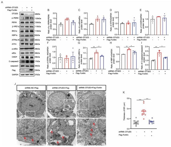 To investigate the role of Fortilin in the regulation of IRE1α activity by OTUD3, we examined the expression of the associated proteins after Fortilin overexpression. We observed that higher levels of the ratio of p-PERK/PERK and the ratio of p-eIf2α/eIf2α in OTUD3 knockdown cells were not affected by Fortilin overexpression. Notably, the ratio of p-IRE1α/IRE1α, cleaved-caspase3/caspase3, and the expression of XBP1s was increased in OTUD3 knockdown cells, and these effects were abated by Fortilin overexpression; there was no difference between the OTUD3 knockdown + Flag-Fortilin and control (Figure 6A–I). Additionally, we observed that the thickness of the ER lumen in OTUD3 knockdown cells was reduced after Fortilin overexpression (Figure 6J,K). The results indicated that Fortilin can relieve ER stress by inhibiting IRE1α pathway.