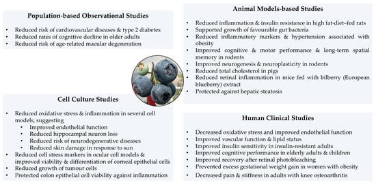 The health benefits of blueberry consumption, either as fruit or products derived from the fruit, have been evidenced from human population observational and clinical research, as well as research using animal models and cell lines as biological models (Figure 2). While the synergistic effect of the numerous phytochemicals present in blueberries is likely responsible for the health benefits, the antioxidative and anti-inflammatory activities derived from the polyphenolic compounds, particularly from the abundantly present anthocyanin pigment, have been highlighted as the contributing factors in most studies. A wild blueberry drink intake for six weeks, as compared to the placebo drink, significantly reduced the levels of endogenously oxidized DNA bases and of H2O2-induced DNA damage, indicating the antioxidative potential of blueberry []. A review of eight clinical trials and 23 animal studies indicated that blueberry consumption significantly reduced oxidative stress in both humans and rodents, concomitantly improved endothelial function in humans, and improved glucose tolerance while reducing triglyceride levels in rodents [].