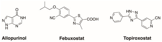 Among the FDA-approved compounds targeting XO, allopurinol, febuxostat and topiroxostat are surely beneficial for treating specific diseases; however, they have been reported to cause, in some cases, severe undesired side-effects. For instance, allopurinol and other purine derivatives have been associated with gastrointestinal distress, renal toxicity, rash and eosinophilia, hampering their broader therapeutic use [3,18]. Febuxostat recently received a black box warning from the FDA due to the increased risk of cardiovascular mortality, thus limiting the use of febuxostat to patients for whom allopurinol is not efficacious or patients who experience severe adverse effects with allopurinol was recommended.
