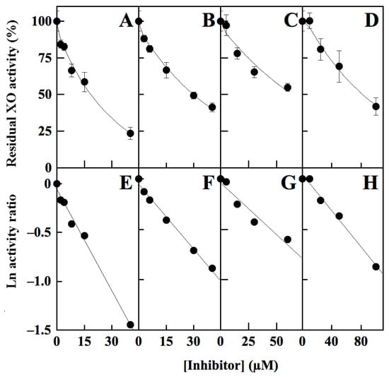 Dose-dependent inhibition profile of xanthine oxidase activity by ALS-28, -8, -15 or -1. The activity of XO (12.5 mU) was measured in buffer A in the presence of 75 µM xanthine through the initial rate of uric acid formation in the presence of the indicated concentration of ALS-28 (panels (A) and (E)), ALS-8 (panels (B) and (F)), ALS-15 (panels (C) and (G)) or ALS-1 (panels (D) and (H)). The activity was expressed either as a percentage of that measured in the absence of inhibitor (panels (A)–(D)) or as a natural logarithm of the ratio of residual activity (panels (E)–(H)). Values were reported as the mean ± SE (panels (A)–(D)); in the logarithmic representation of the data (panels (E)–(H)), the correlation coefficients R ranged in the 0.966–0.995 interval. Other details are described in Materials and Methods.