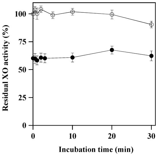 Reversibility of the inhibition by ALS-28 in xanthine oxidase samples incubated at 25 °C. A sample of XO (0.136 U/L in buffer A) was incubated at 25 °C in the absence (open circles) or presence of 60 µM ALS-28 (filled circles). At the indicated times, 125 µL aliquots were withdrawn and then immediately assayed for XO activity after the addition of 375 µL of 100 µM xanthine in buffer A. The residual XO activity was expressed as a percentage of that measured in the absence of inhibitor at time zero. Values were reported as the mean ± SE. Other details are described in Materials and Methods.