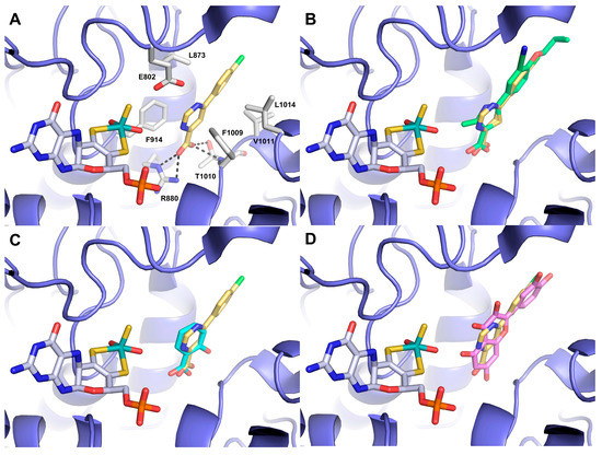 In order to shed light on the potential binding mode of compounds ALS-28, -8, -15 and -1 and to aid the interpretation of SAR data, we undertook docking studies using the X-ray structure of XO in complex with the FDA-approved inhibitor TEI-6720 (febuxostat) [41]. The top-ranked docking pose showed that ALS-28, the most potent compound, was well positioned within the enzyme active site, adjacent to the molybdopterin cofactor, where the substrate binds and is oxidised (Figure 5A). The carboxylate moiety engaged a strong salt bridge with R880 and two H-bonds with the side chain and the NH main chain of T1010. These residues are known to contribute to the enzyme’s catalytic mechanism [31]. In addition, the pyrimidine ring is sandwiched between two phenylalanine residues, F914 and F1009, which form a parallel and T-shaped p–p stacking interaction, respectively. The p-Cl-phenyl ring contributes further hydrophobic interactions with L1014, V1011 and L873. The overall binding mode revealed that the bound inhibitor hinders the cavity channel, thus blocking the binding of the substrate and its movement towards the metal complex, which is consistent with the competitive mechanism observed in kinetic studies. The docked pose of ALS-28 displayed a good overlap with the crystallographic pose of febuxostat (Figure 5B), with a particular regard to their carboxylic acid moieties and the heterocyclic scaffolds. A nearly perfect fit could also be observed with salicylic acid (Figure 5C), which acts as a competitive inhibitor. Another inhibitor classified as competitive is quercetin: its crystallographic pose showed a similar positioning to ALS-28, even though quercetin approaches more closely to the molybdopterin cofactor (Figure 5D).