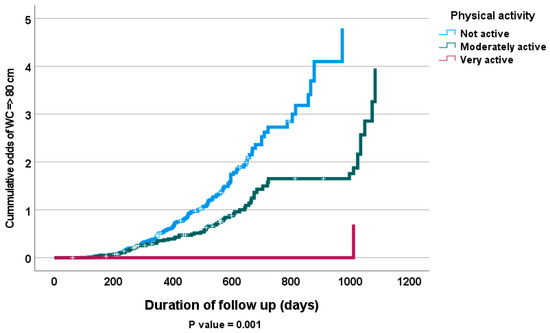 Kaplan–Meier of cumulative odds of WC => 80 cm in female subjects according to levels of physical activity at follow up.