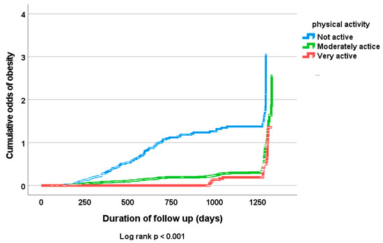 Kaplan–Meier of cumulative odds of diagnosis of obesity (BMI => 30) at follow up in all subjects according to levels of physical activity.