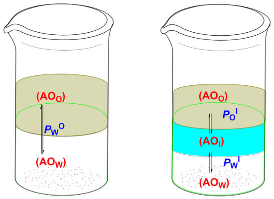 (1) The partition constant value of a molecule (e.g., antioxidant (AO)) is frequently employed as a “measure” of its relative affinity to be incorporated in a given region (Figure 1), and its “tendency” to be dissolved in such a region depends on the value and sign of the Gibbs free energy of transfer from one region to another one (ΔGtransfer < 0) [23,24,25,26,27]. In binary oil–water mixtures, the distribution of an antioxidant can be described by one partition constant PWO, while in emulsified systems, two partition constants are needed, PWI (that between the aqueous and interfacial regions) and POI (that between the oil and interfacial regions), Figure 1.