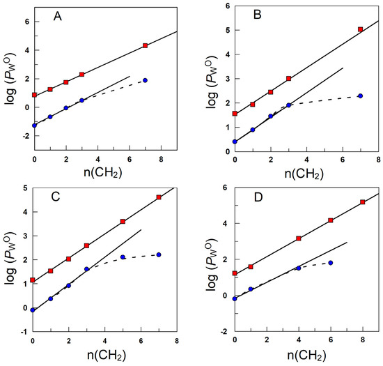 According to the fragment approach, the contributions to PWO come from three fragments. One is that of the polyphenolic moiety, the second one is that of terminal methyl group, and the third one is that from the methylene groups. Both the aromatic moiety and the terminal methyl group are the same for all individuals of each series, and thus make a constant contribution to PWO. However, the contribution coming from methylene groups is not constant because the different species contain a variable number of carbon atoms. Thus, the log(PWO) values of each series of homologous antioxidants (Table 4) can be computed as the sum of two main contributions, in Equation (5), where parameter aO stands for the (constant) contribution of the non-alkyl part of the molecule to PWO, bO stands for the contribution of each methylene group, and nCH2 is the number of methylene groups in the alkyl chain of the antioxidant. This linear relationship between log(PWO) and the contribution of methylene groups in the series of homologous compounds is usually known as the Colander relationship [73], predicting that an increase in the number of C atoms in the alkyl chain will increase the hydrophobicity of the AOs and thus its solubility in oil [67].