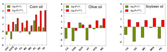 Figure 4 shows the experimental PWO values determined for a variety of antioxidants in different oils and, for comparisons the computer estimated PWOCT values for the same antioxidants. As can be observed, there were significant differences between the PWOCT and PWO values for the different antioxidants and oils. Such a difference can be interpreted in terms of the expected higher hydrogen bond donating capacity of octanol compared with that of common edible oils, because the main component of octanol has one hydroxyl group, meanwhile edible oils are composed of glycerol esters present in different percentages. Thus, the intermolecular forces present in, for example, octanol, should be very different in size from those in edible oils. Hence, the results in Figure 4 clearly show that PWOCT values cannot be used to predict the hydrophobicity of antioxidants in edible oils and that PWO values should be determined for each antioxidant and edible oil.