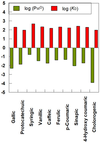 Vañova et al. [77] determined, by employing micellar electrokinetic chromatography, the association constants of a series of phenolic acids between water and SDS micelles (KD), and, when comparing them with the theoretically determined octanol–water (PWOCT) partition constants (Molinspiration, accessed on 23 February 2023; Figure 6,) no relationship could be established between them, confirming that the values of the association constant KD could not be predicted from the PWOCT values.