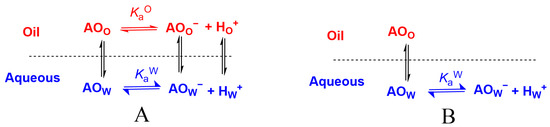 Distribution of an ionizable antioxidant AO in a biphasic oil–water system. (A) Assuming that ionization can take place in both phases. (B) Assuming that ionization only takes place in the aqueous phase. KaW and KaO are the ionization constant of the antioxidant in the aqueous and oil phases, respectively.