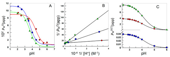 In the case that, for any reason, the value of PWO is unknown and/or cannot be determined experimentally, Equation (6) can be linearized so that the variation of 1/PWO (app) with 1/[H+] should be linear from where the value of PWO can be determined, as illustrated in Figure 8B.